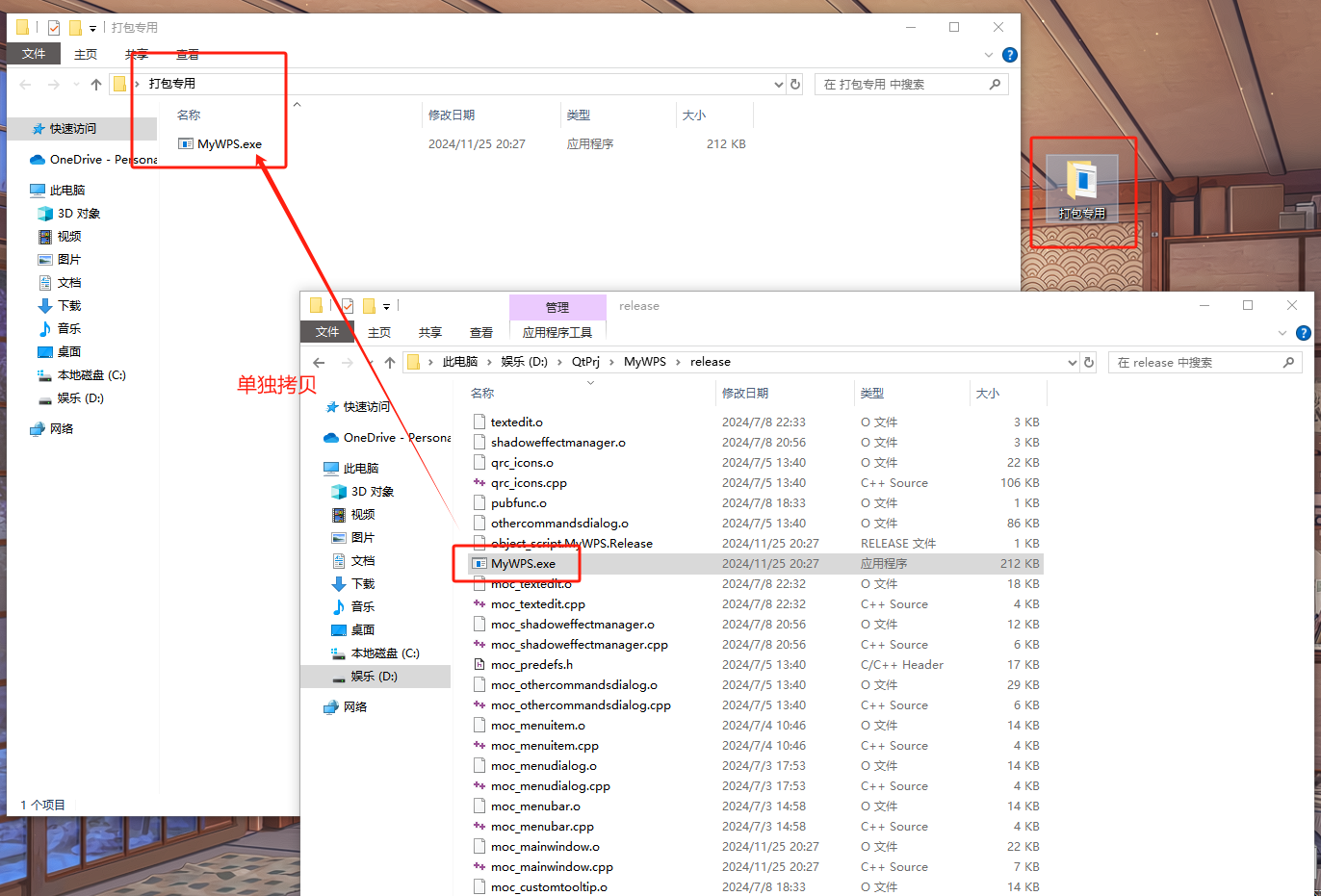 2、在电脑桌面新建一个文件夹,然后单独拷贝改.exe可应用程序到该文件夹下,如图中MyWPS.exe